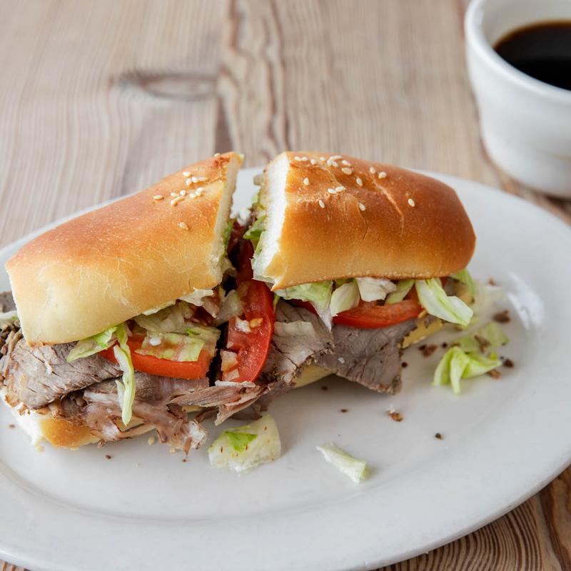 Roast beef served with a cup of beef juice. Available dressed; with lettuce, tomato, and mayo. Mini 8.90 | Large 11.00